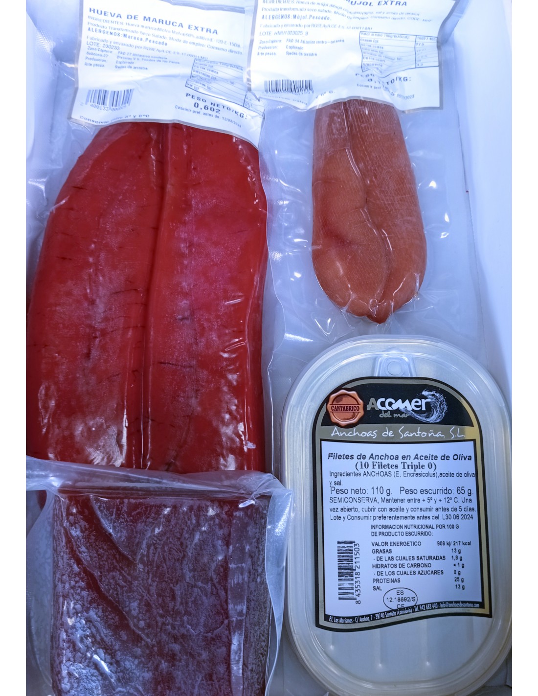 Lote gourmet de salazones con mojama extra, hueva de maruca, anchoa de Santoña y hueva de mujol. Selección premium ideal para tapas y gastronomía del mar.