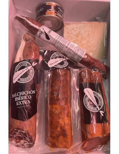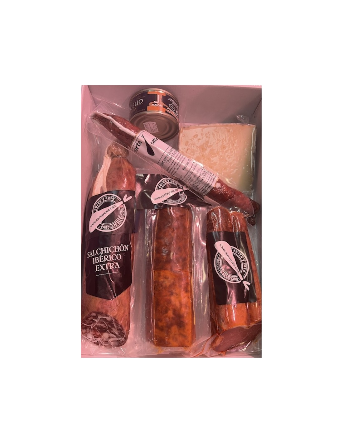Chorizo Ibérico, Salchichón Ibérico Extra, Fuet y Lomo Ibérico en trozos, Cuña de queso Manchego y Lata de paté.