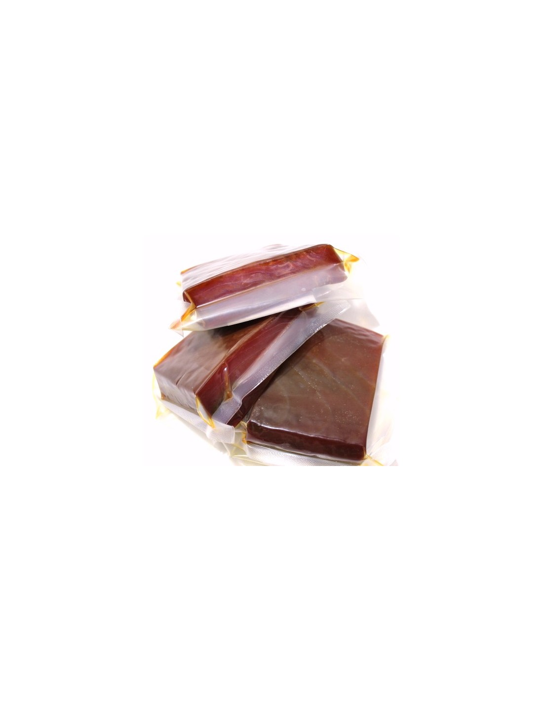Mojama de Thon Extra. Elle est obtenue à partir de la partie la plus noble du thon, le longe, après un processus de salage et de séchage, ainsi qu'une sélection minutieuse. Nous la servons en morceaux de 250-350 gr, emballés sous vide.