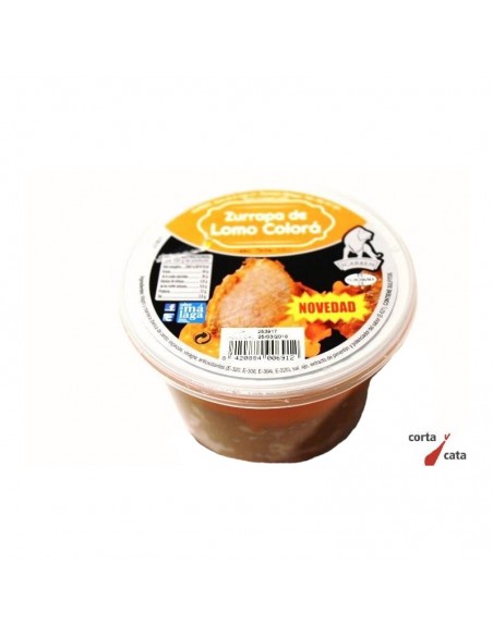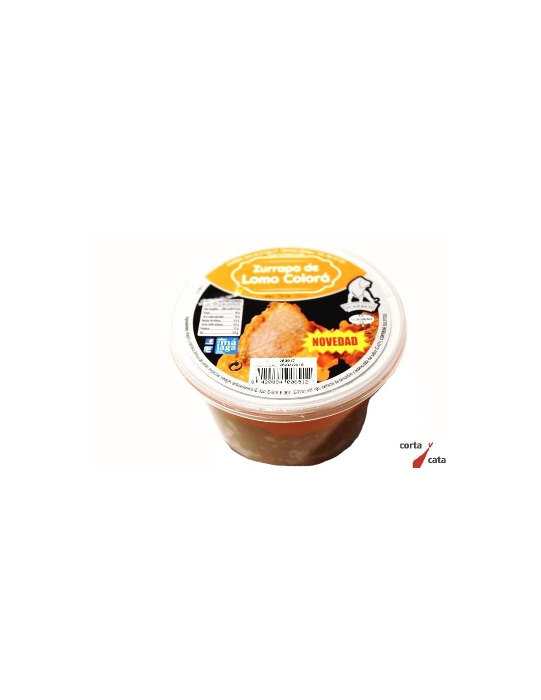 Magret de porc frit dans du beurre coloré ibérique, coupé en copeaux. Produit artisanal réalisé dans la région montagneuse de Ronda à Benaoján, situé à Malaga. Zurrapa avec un goût, une couleur et un arôme intenses grâce à ses épices naturelles comme le paprika, réalisé avec un processus qui récupère toute la tradition.