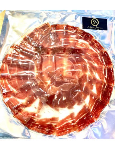 Jambon Ibérique de Bellota coupé à la main, emballé en sachets de 100 gr. et présenté en rond pour ouvrir, dresser et déguster. Étiquette Noire 100% ibérique Bellota.