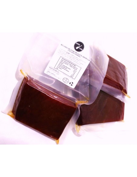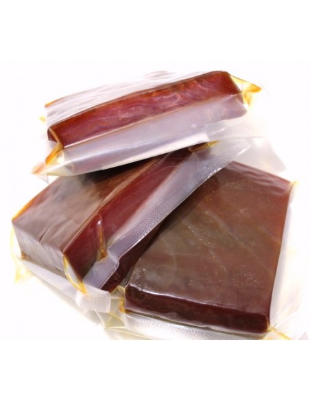 Extra Tuna Mojama. It is obtained from the noblest part of the tuna, the loin, after undergoing a process of salting, drying, and careful selection. We serve it in pieces of 250-350 grams vacuum-packed.